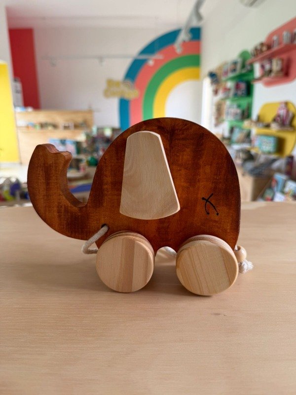Juego de arrastre con forma de elefante realizado en100% madera maciza. Es liviano para que puedan manipularlo con facilidad. Contiene tira de cordón de algodón.