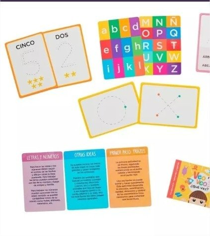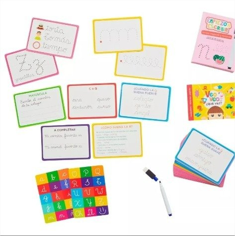 Juego de cartas + marcador. Contiene grafismos, abecedario y números marcados para iniciarse en la escritura.