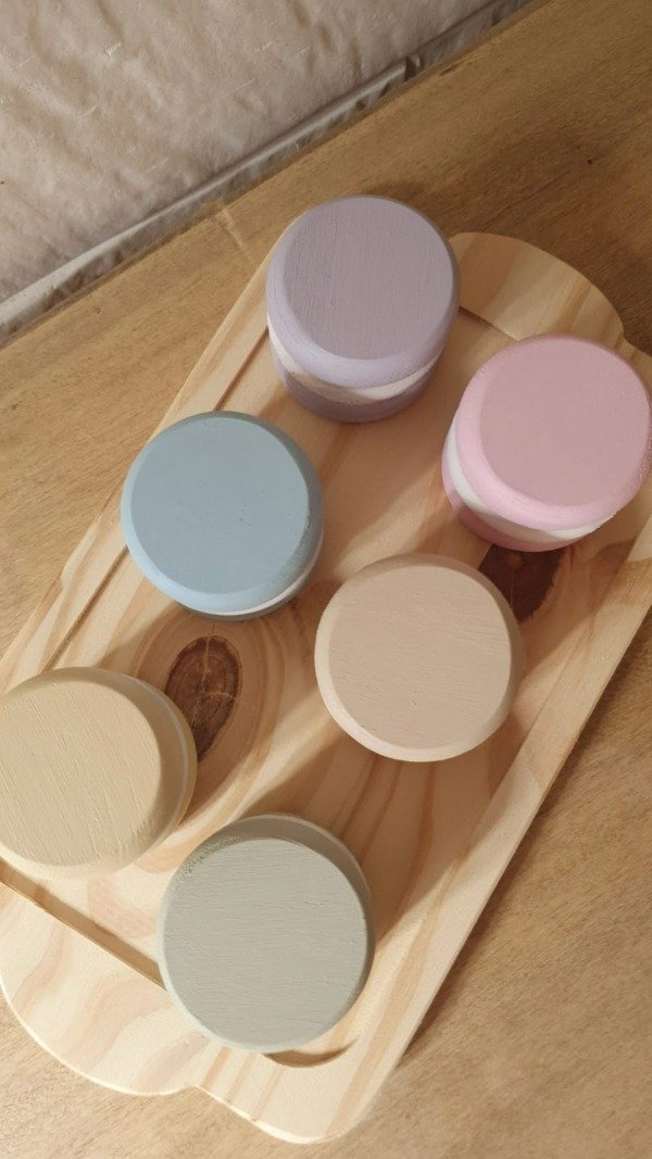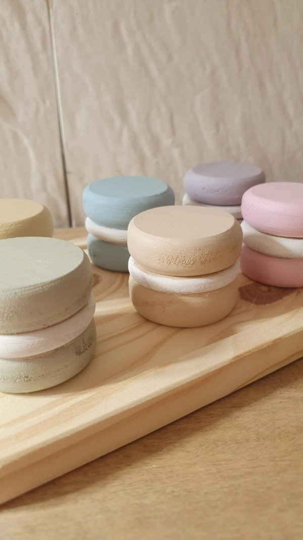 Alfajores de madera maciza pintados a mano. Incluye 6 alfajores/macarones y bandeja.