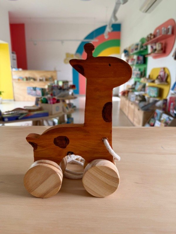 Juego de arrastre con forma de jirafa reallizado en100% madera maciza. Es liviano para que puedan manipularlo con facilidad. Contiene tira de cordón de algodón.