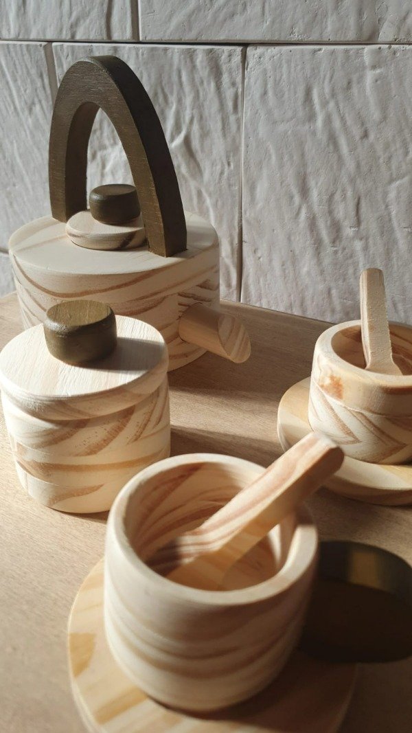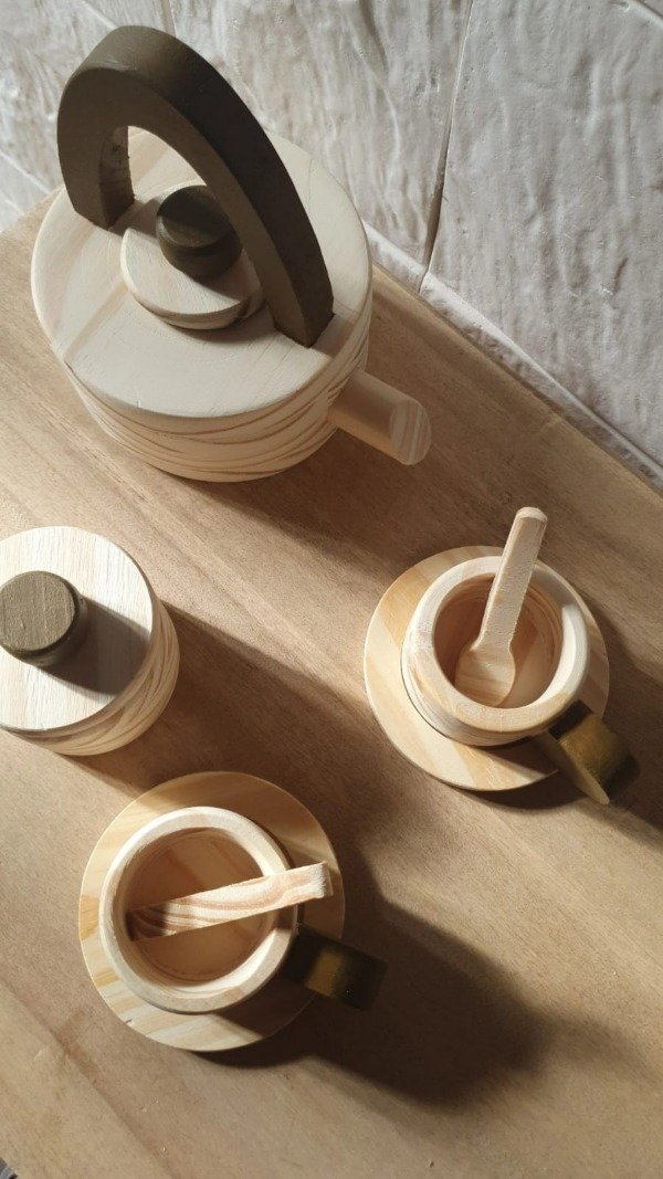 Confeccionado en madera maciza y pintado a mano. Incluye pava, 2 tazas, 2 platos, 2 cucharas y azucarera con tapa.