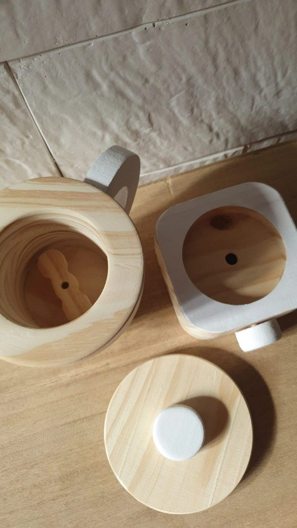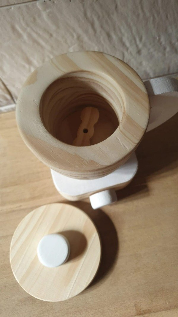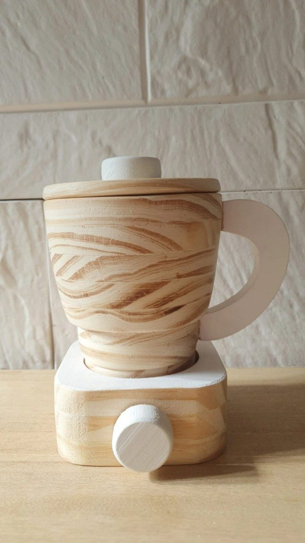 Licuadora de madera maciza pintada a mano. El @vaso" de la licuadora es desmontable de la base. La perrilla es móvil.
