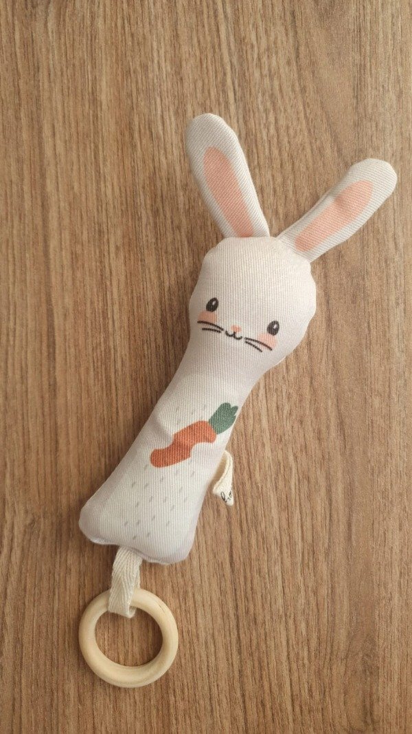 Sonajero bastón ideal para sostener primeros objetos. Es liviano y su tamaño de 20 cm aprox. permite que las manos del bebé accedan a sujetarlo. Contiene una arandela de madera para ofrecer otro medio de manipulación y ruidito sonajero al agitarlo en su interior.