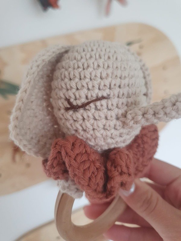 Sonajero tejido con algodón hipoalergénico relleno de vellón. Tiene un mordillo de madera lijada a mano que asegura un tacto suave y seguro para el bebé. Cuenta con un sonajero con sonido suave que estimula los sentidos auditivos del bebé. Es liviano y su tamaño permite que las manos del bebé puedan sujetarlo. Este es el juguete ideal para un recién nacido, ya que con su sonido y texturas desarrollan habilidades sensoriales. Se puede lavar a mano con agua fría.