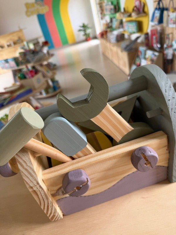 Confeccionado en madera maciza y pintado a mano. Incluye caja, martillo, serrucho, taladro, destornillador, llave ajustable, y regla