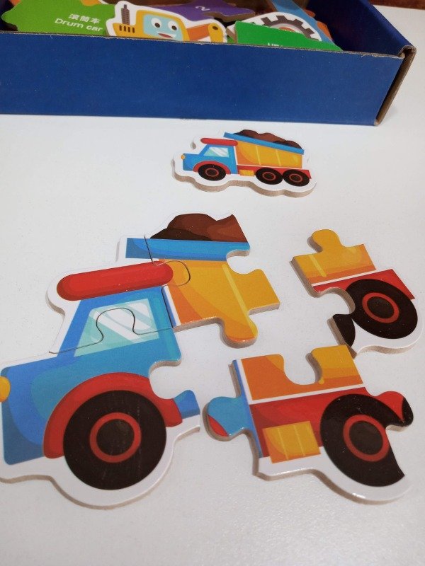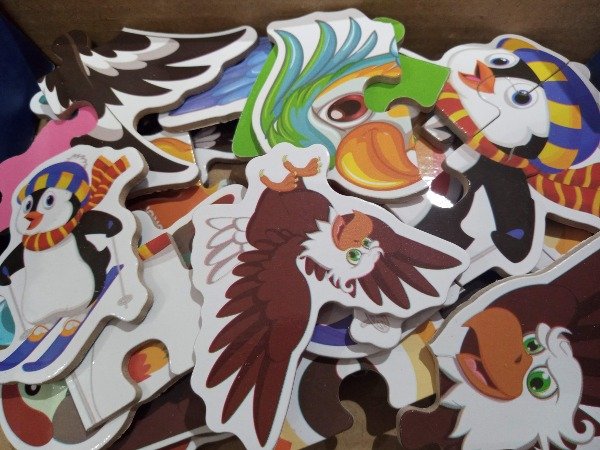 Son 6 rompecabezas para armar donde cada uno contiene 1 figura entera para guiarse en el armado, del revés cada pieza esta enumerada y de un color distinto por cada rompecabezas